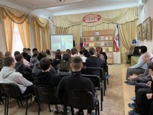 Лекция включала видеоролики о боевых действиях, сопровождающиеся проникновенными песнями «От героев былых времен», «Офицеры», «Встанем».